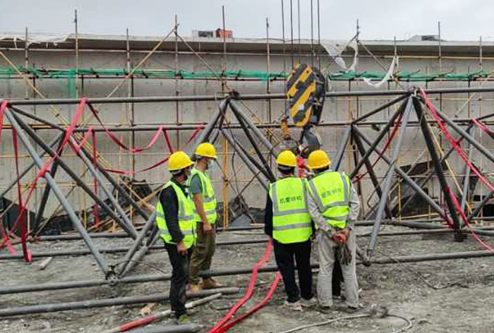 3、華亭煤礦網(wǎng)架工程開工前須組織人員勘察現(xiàn)場,復(fù)核軸線尺寸及預(yù)埋件的標(biāo)高、平面位移是否符合設(shè)計要求。